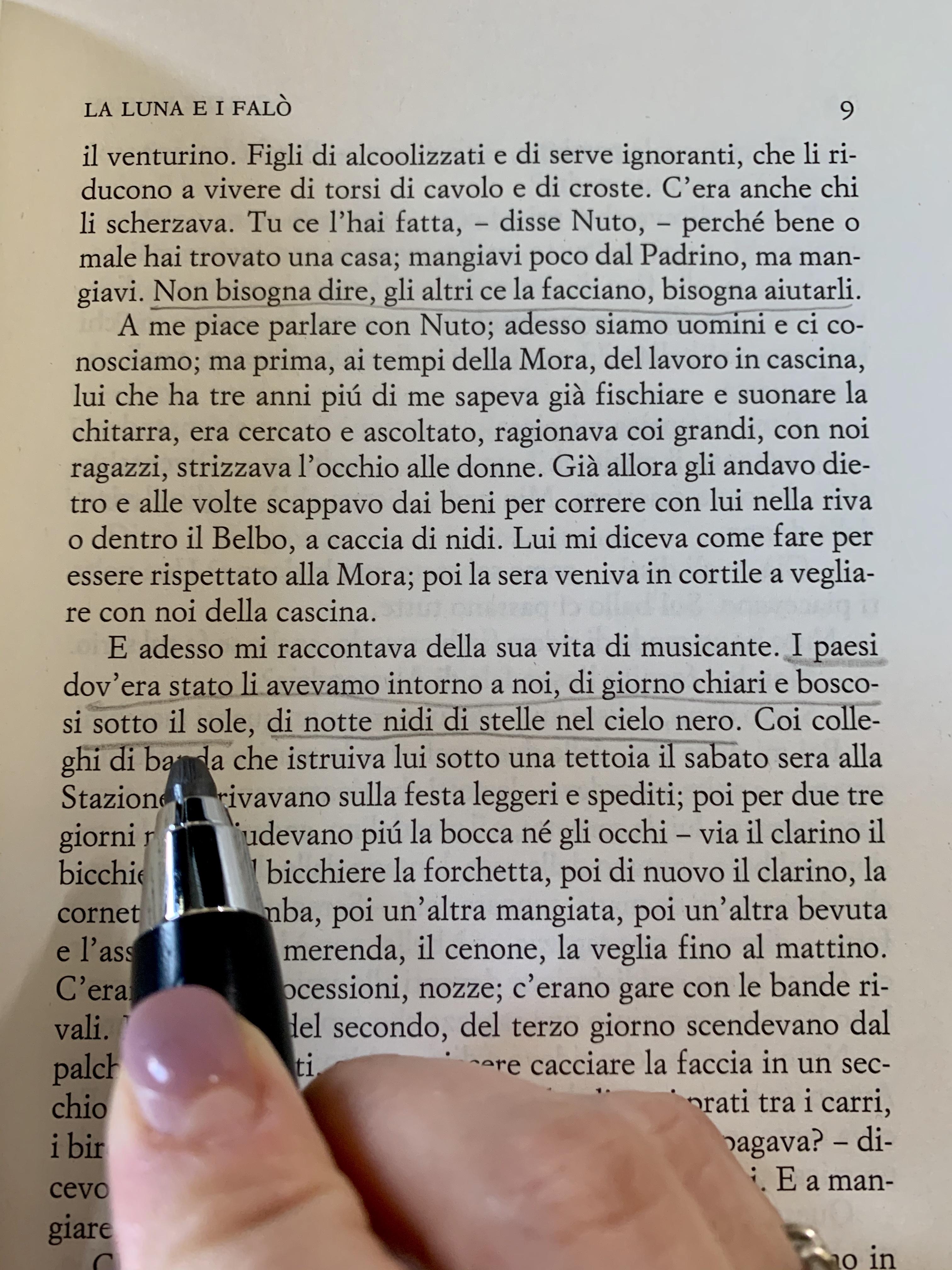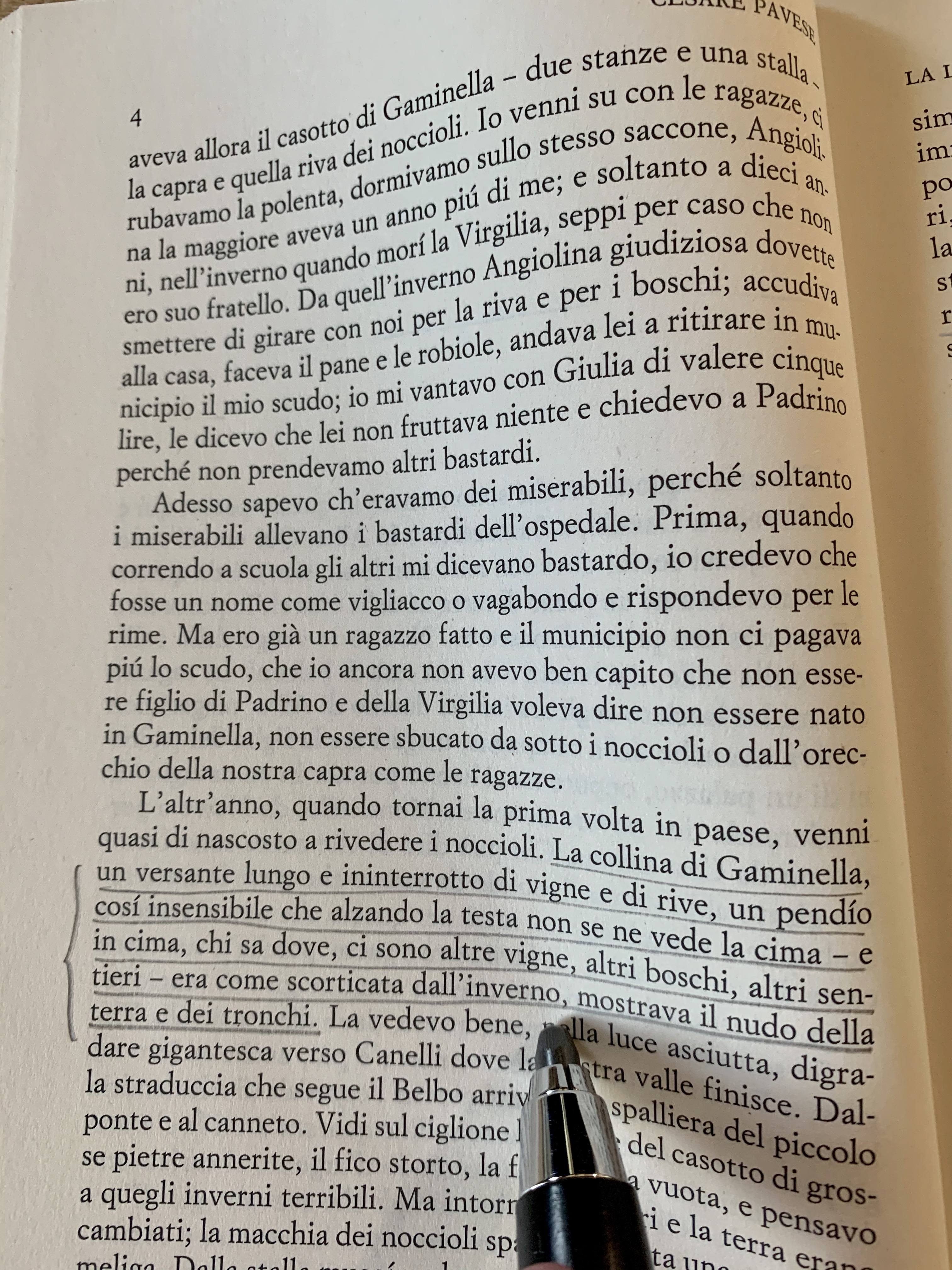 L’ambientazione è per me l’aspetto più bello di tutto il libro. I luoghi descritti da Pavese sembrano poter esistere per sempre, in una dimensione senza tempo. Come se quella natura, quelle colline, quei noccioli non potessero cambiare. E invece cambiano e anche Anguilla se ne rende conto. Da qui tutta la tragica malinconia del libro.